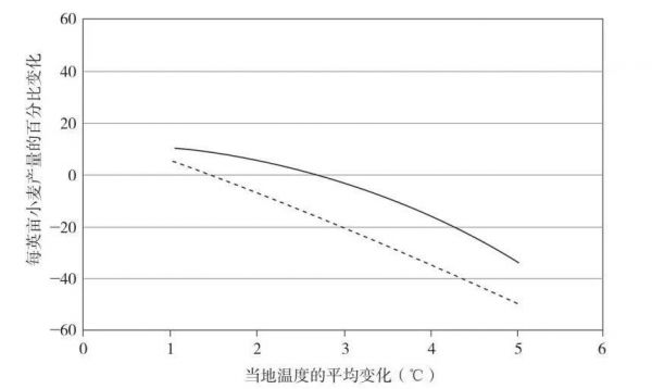 如图所示,根据诺贝尔经济奖得主威威廉·诺德豪斯在《气候赌场》中的研究,小麦亩产量会随着平均气温的上升显著下降(图中虚线和实线分别代表保守和激进的预测)。当温度只升高1°C-2°C时,小麦产量可能提高,但温度继续升高,产量会迅速下降。