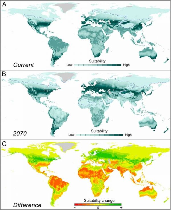 上图中A和B分别是当前和预期50年后的全球宜居程度,图C对比了当前和2070年时气候宜居带的变化程度。可见,除了前文提到的由于全球变暖而变的不适合人类居住的区域,全球部分区域,也会由于全球变暖变得更加宜居,例如中国东北部及东欧地区会变得宜居。