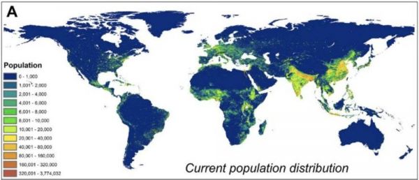 图6:当前全球人口密度分布,可见受到影响的区域,正是人口密度最大的区域