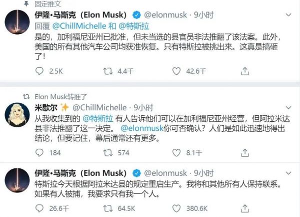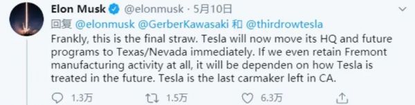 心急火燎的马斯克又将「攻击」的阵地搬到社交平台上,他接连发推表达对政府的不满。比如:「特斯拉将会向 Alameda 县政府发起诉讼,当地未经选举且无知的临时卫生官员已经违反了州政府、总统的命令,侵犯了宪法赋予人民的权利,甚至背离了最基本的常识」、「如果加州继续干涉Fremont工厂生产,将立刻把特斯拉总部搬到得克萨斯州或者内华达州」。末了还不忘提醒当地政府,特斯拉可是加州在汽车领域仅存的独苗了。