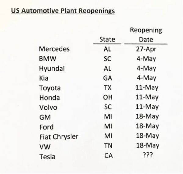 美国汽车工厂复工时间表,唯独特斯拉是问号