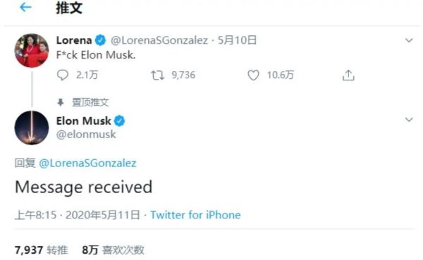 措辞锋利,丝毫没有掩饰内心的不满之情。马斯克在线硬刚政府的行为就连已经离职的前政府职员都看不下去了。一位曾是加州劳工领袖的女士 Lorena 公开发文「F***马斯克」,当然马斯克也不忘礼貌的回应。