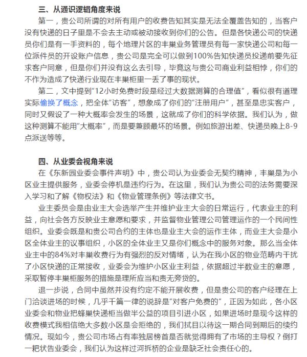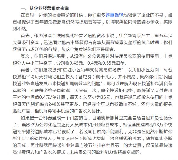 而之所以火速俘获广大网友,除了在上海首个叫停丰巢快递柜,更多的则是这篇三千字檄文有理有利有节从企业经营、业务流程、通识逻辑及业委会角度硬核“拷问”丰巢,堪称直击“灵魂深处”的拷问。如关于丰巢形成寡头垄断占市场近70%的市场份额不是弱者,丰巢快递柜的经营与进驻小区时的收费和谈判细节,以及丰巢相关的公开回复都做出了逐条分析。
