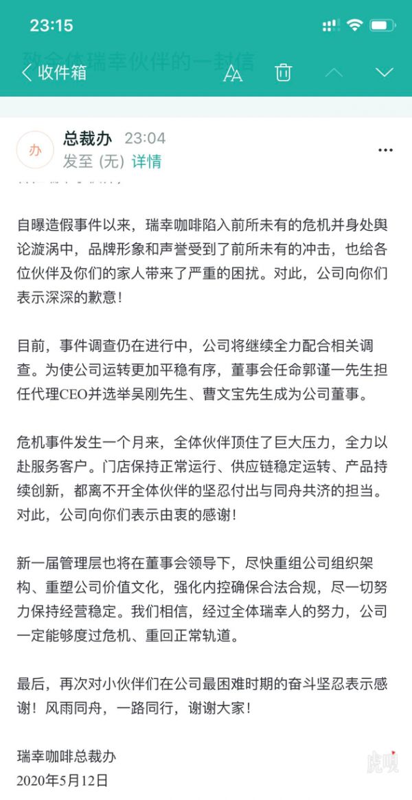 瑞幸因形象受损向员工道歉,称一定能够度过危机