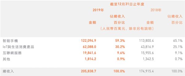 ▲小米2019年财报业务营收分布