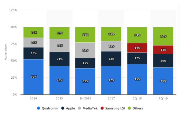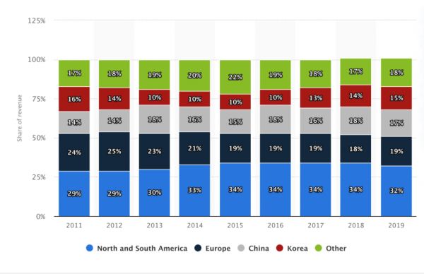 图1:三星全球营收比例(2011-2019) 数据来源:statista.