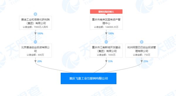 重庆飞象工业互联网有限公司成立于2014年3月,法定代表人为刘参验,公司经营范围包括一般项目:开展工业和信息化行业的调研分析、产业规划、项目可行性研究、行业规划咨询、展览展示服务等。天眼查数据显示,目前,该公司在工商系统上披露的股东中,第一大为重庆市江南新城开发建设(集团)有限公司(由重庆市南岸区国有资产管理中心全资持股),持股比例55%;杭州阿里巴巴创业投资管理有限公司为第二大股东,持股比例25%;北京赛迪创业投资有限公司为第三大股东,持股比例20%。