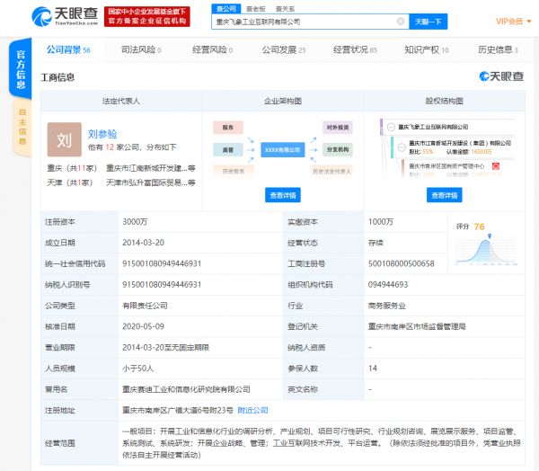 阿里投资重庆飞象工业互联网750万元,持股25%