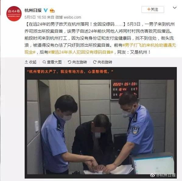 5月5日,杭州日报报道,太阳还没下山,天气依旧十分闷热。一名中年男子拖着疲惫的步伐来派出所自首。他是甘肃人,24年前因为一件琐事,将同村村民伤害致死后潜逃至今,多年一直在全国各地漂泊,靠打零工为生。如果不是到处都在查绿码太严格,他可能永远不会落网——健康码的功能发展有了一个案例。