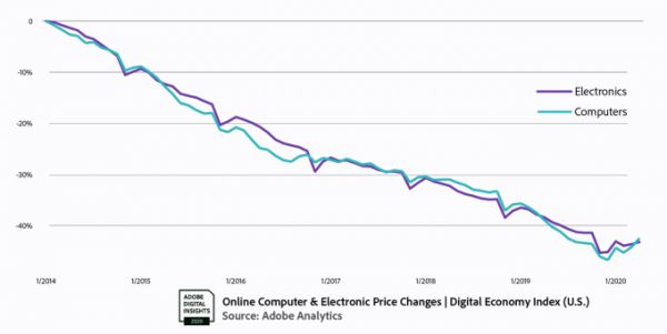 同时,在线销售的电子类产品价格出现了多年来首次持稳。据Adobe称,自2014年以来,在线电子产品价格一直在以稳定的速度下滑,但COVID-19疫情保持了电子产品价格在一个稳定水平。