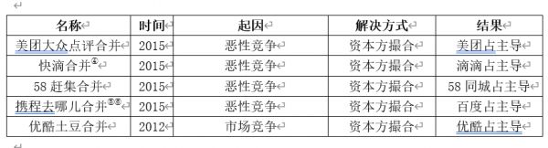 例如美团大众点评、快滴、58赶集、携程去哪儿、优酷土豆合并等等,主导力量都离不开背后的资本方,最终结果都是其中一方受到背后资本方青睐而占据优势,成为事实上的胜利者。