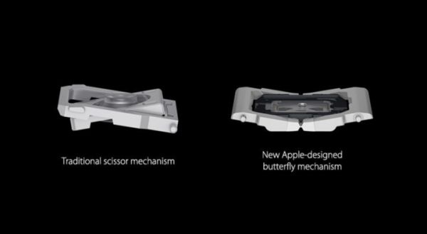 蝶式键盘的设计最早出现在 2015 款的 12 英寸 MacBook 上,蝶式键盘的优点在于能够做的非常薄,同时仍然能够保证受力均匀性,键帽也能够做的更大。