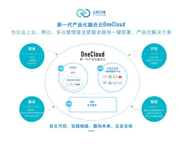 OneCloud,为企业上云、用云、多云管理等全部需求提供一键部署、产品化解决方案。客户通过“一朵”融合云来管理全部异构IT基础设施,无论是企业本地的裸金属环境、虚拟化环境,还是各种公有云环境。融合云屏蔽了混合云及多云管理的复杂度,将企业从繁琐的云资源管理中解放出来,在今年初,公司也发布了融合云3.0版本,将自身产品容器化。