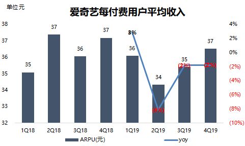 截至2019年Q4,爱奇艺从每个会员用户身上获取的收入为37元,考虑到各种会员折扣,以及联名会员促销等,实际的会员ARPU值比37元低。