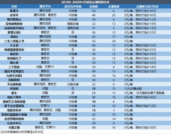 注:表中前5部的上线时间为2019年,数据整理自平台公开资料