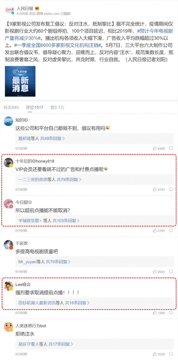 不过值得注意的是,在人民日报发布影视行业自救倡议内容的相关微博下,热门评论中有不少用户在吐槽视频网站频频试水的会员 “超前点播”。自去年《陈情令》和《庆余年》试水超前点播引发用户情绪的大幅反弹之后,部分消费者对于买了会员之后还要额外付费这件事表示依然不能理解。