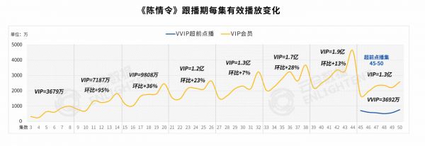 超前点播确实在一定程度上折损了普通会员对剧集的观看情况。从云合数据统计的会员内容有效播放来看,《陈情令》在最后5集开启了VVIP超前点播,导致实际的VIP会员有效播放量下滑明显,为1.3亿。