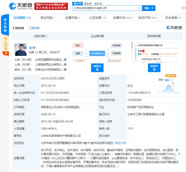 北京车和家信息技术有限公司成立于2015年4月,法定代表人为公司创始人兼董事长李想。经营范围包括技术开发、技术转让、技术咨询、技术服务;会议服务;承办展览展示活动;汽车租赁等。天眼查股东信息显示,目前,其工商系统登记中的最大股东为李想本人,持股比例为61.5%。李想亦为公司疑似实际控制人。