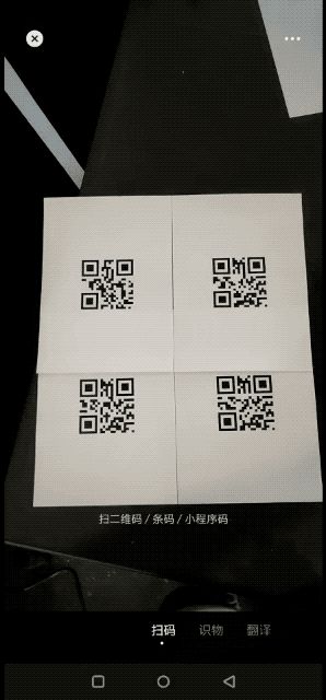 没有固定扫描框的微信扫一扫可同时识别多个二维码(注:目前该功能仅在部分 Android 客户端中灰度测试)