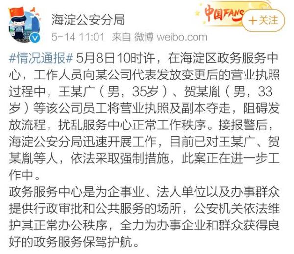 通报称:"5月8日10时许,在海淀区政务服务中心,工作人员向某公司代表发放变更后的营业执照过程中,王某广(男,35岁)、贺某胤(男,33岁)等该公司员工将营业执照及副本夺走,阻碍发放流程,扰乱服务中心正常工作秩序。接报警后,海淀公安分局迅速开展工作,目前已对王某广、贺某胤等人,依法采取强制措施,此案正在进一步工作中。政务服务中心是为企事业、法人单位以及办事群众提供行政审批和公共服务的场所,公安机关依法维护其正常办公秩序,全力为办事企业和群众获得良好的政务服务保驾护航。"