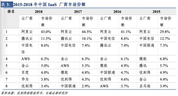 同样,云计算 2.0 也意味着市场集中程度会进一步提高,增速差距扩大,寡头竞争局势确立。目前全球公有云 IAAS 供应商 Top5 包括亚马逊、微软、阿里巴巴、谷歌和 IBM。据长城证券,2018 年 Top5 占据了全球 IaaS 市场近 77% 的份额,营收整体增长约为 39%,其他厂商收入整体增长仅有 11.1%。