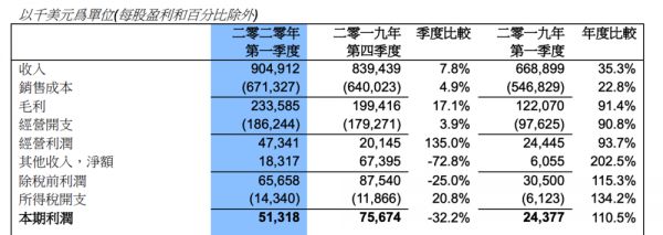 首先是营收方面,中芯国际 2020 Q1 营收 9.05 亿美元,较上年同期增长35.3%,较上一季度环比提升 7.8%。