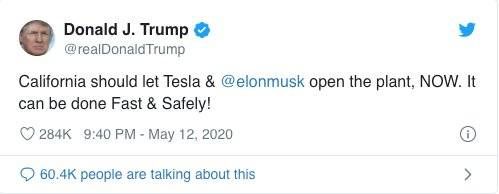在经济重启问题上,美国展开了一场全国争论,政治因素已卷入其中。美国总统特朗普已经炮轰密歇根州等几个州,认为这些由民主党人担任州长的州复工太慢。周二,特朗普在Twitter上力挺马斯克,认为加州应该立即让特斯拉复工,认为特斯拉可以迅速而又安全的复工。对此,马斯克表示感谢。