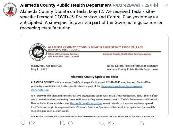 周二晚间,阿拉米达县表示,正在评估特斯拉的复工计划,并寻求让特斯拉采取额外措施。该县称,一旦复工条件满足,特斯拉就可以维持最低限度运营,以便为“最快于下周”的复工作准备。然而,马斯克已表示,特斯拉生产已经恢复。