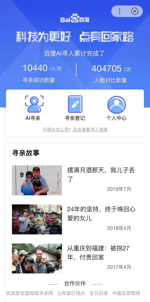 2016年末,百度启动了这一项目,接入了民政部、宝贝回家、反邪教网等平台的权威数据,帮助走失人员、寻亲者和公益机构、志愿者寻亲。每天,都有超过33万名宝贝回家志愿者,利用这一平台辅助寻亲。