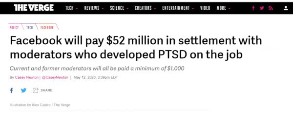 消息原文:“Facebook承认内容审核会给员工造成巨大的损失,这一次,是具有里程碑意义的承认。Facebook同意向现职和前任审核人员支付5200万美元,以补偿他们因工作出现的心理健康问题。