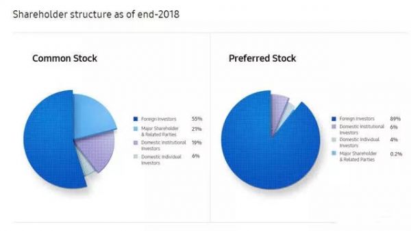 从三星电子2018年股权结构来看,普通股中,外国投资者占比达到了55%。优先股中,外国投资者持有了夸张的89%的优先股。