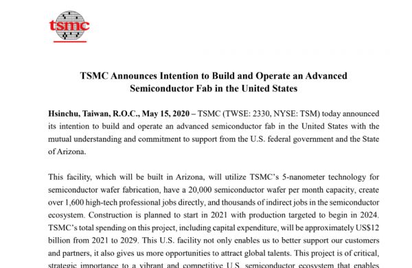 近日,美国欲在本国建晶圆厂的消息频出,起先是有知情人士传出,特朗普政府官员正在与台积电(TSMC)进行谈判 ,以在美国建厂。而根据半导体行业观察获悉,台积电已经宣布了其在美国的建厂计划。根据台积电的公告,该工厂将生产5nm芯片,规划产能是2万片每月。