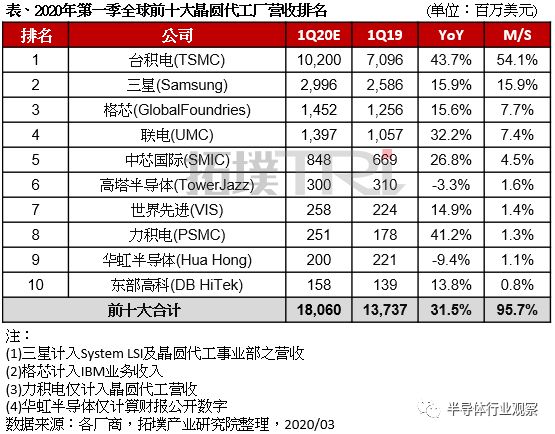 如今,三十年过去了,晶圆代工已经成了半导体业界极其重要的一项业务。根据集邦咨询旗下拓墣产业研究院最新数据分析,2020年第一季前十大晶圆代工厂分别为:台积电、三星、格芯、联电、中芯国际、高塔半导体、世界先进、力积电、华虹半导体以及东部高科。
