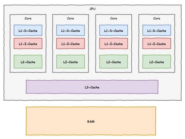 现在,我们用上了三级缓存技术,内存那家伙拖后腿的现象缓解了不少,相当部分时间我们都能从这三级缓存里面找到我们需要的数据。
