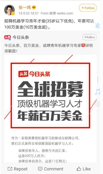 2015 年,张一鸣在自己的微博上发出了 100 万美金招聘顶级机器学习人才的广告,联系人方式一栏里,只写了他本人的邮箱地址。当时互联网还正处于招移动端、iOS 技术人员的阶段,字节跳动估值也还没达到 10 亿美金,高薪招收算法人才的这个举动非常引人注目。几天后,他收到了十几封求职邮件,大部分是供职于 Google、Facebook、Twitter 和 YouTube 等大公司的高端技术人才。