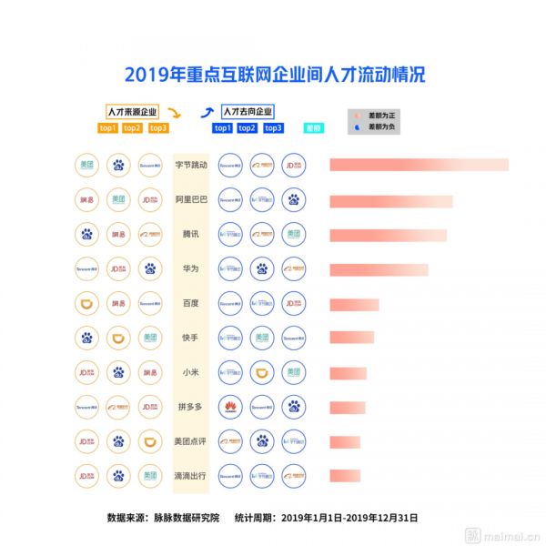 2019 年脉脉互联网人才流向报告显示,字节跳动的崛起,改变了互联网行业人才原有的流动格局。数据显示,2018 年开始,字节跳动与阿里巴巴一起吸纳腾讯和百度人才。2019 年,字节跳动与腾讯和阿里巴巴组成新的“BAT”人才库,技术人才对于字节跳动的热爱在所有公司中处于绝对的优势,字节跳动成为了互联网人才跳槽“首选”。