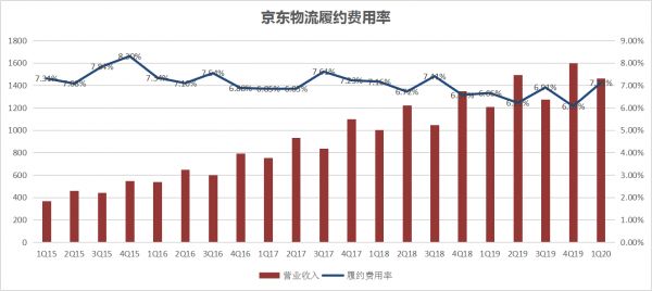 在一季度相对淡季的行业背景下,京东履约费用率较上个季度及2019年同期均有所上涨,这是因为仓储物流成本大幅增长,达到了前所未有的104亿元(首次超过百亿元),同时该季度营收增速持续放缓。与2019年四个季度20.9%、22.9%、28.7%、26.6%的营收同比增幅相比,2020年Q1的20.7%略显疲态。