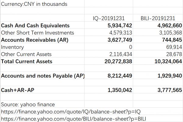 爱奇艺和B站各自有多少类现金资产可以拉拉表看,参见下图,这是截止2019年底的相关数字,大家可以自行评判: