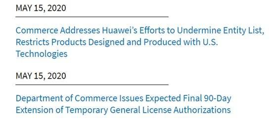 美国时间5月15日,美国商务部在官网上连续发布了两条消息,都是关于华为的。