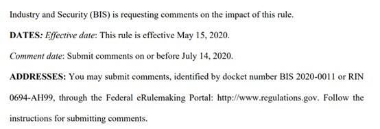 已经明确的说明了“This rule is effective May 15,2020”,也就是在2020年5月15日生效。不过公众、企业和组织可以在7月14日之前提交意见。以上文档将在5月19日正式发布在美国联邦政府网站。