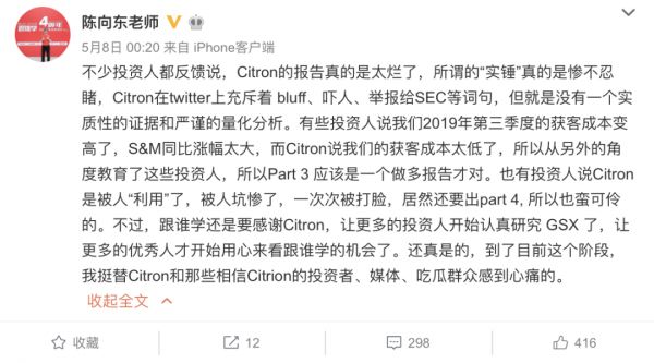 面对做空机构存在重大基本事实失误的报告,跟谁学底气很足,其董事长陈向东在微博发文,罗列了不少投资人认为香橼做空报告“太烂了”的看法,直言“到了目前这个阶段,我挺替Citron(香橼)和那些相信Citrion的投资者、媒体、吃瓜群众感到心痛的。”