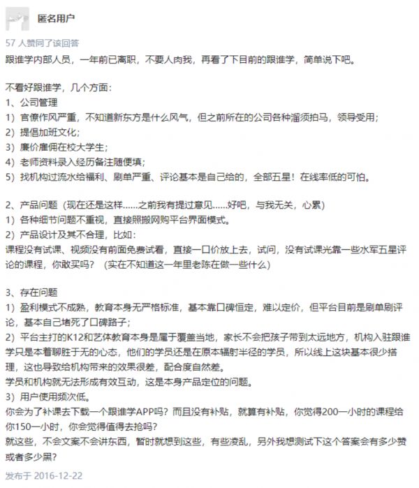 针对跟谁学的报告中同样也引用了离职员工说法,试图攻击跟谁学的师资质量并没有它宣传的那么好,但灰熊的报告中却连采访都没有,给出的仅是几张2016、2017年的知乎截图。
