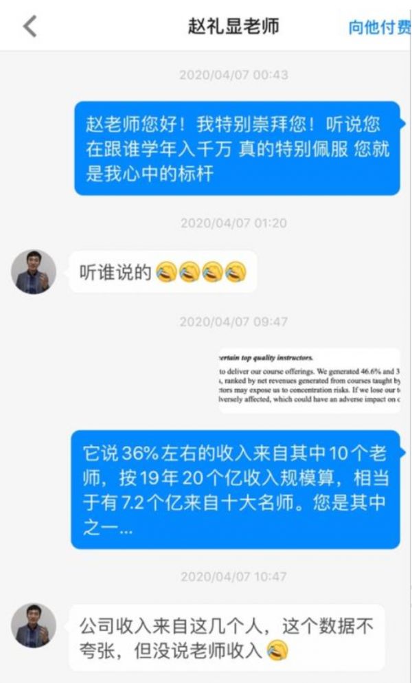 在报告中,天蝎创投称,根据财报数据及平台分成比例,跟谁学名师的平均平台分成预计是上千万的级别。但是与十大名师之一的赵礼显取得沟通后,认为其年薪是没有千万的,如果教师在薪资方面没有说谎,那么一定是公司在营收方面说了谎。