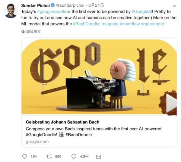 Google CEO Sundar Pichai 转发分享巴赫 Doodle | 推特截图