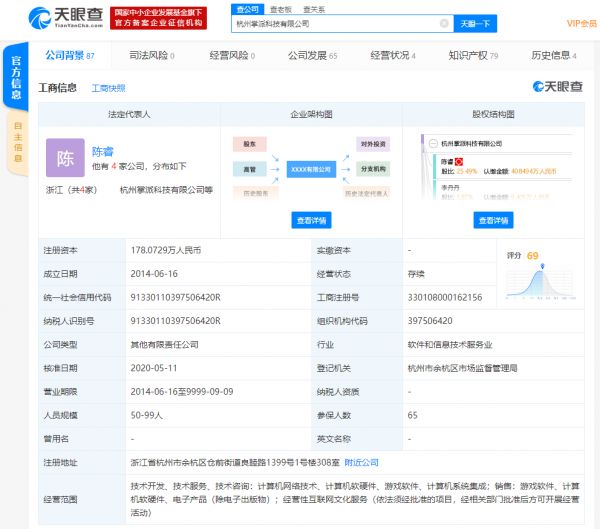 杭州掌派科技有限公司成立于2014年6月,注册资本约178万人民币,法定代表人为陈睿,公司经营范围包括计算机网络技术、计算机软硬件、游戏软件、计算机系统集成;销售:游戏软件、计算机软硬件、电子产品(除电子出版物);经营性互联网文化服务等。