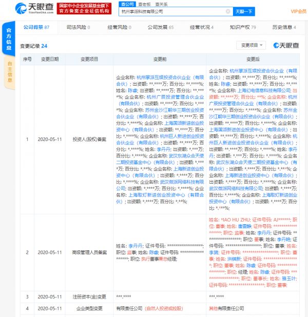 网易科技讯 5月18日消息,天眼查数据显示,5月11日,掌派科技的关联公司杭州掌派科技有限公司发生工商变更,投资人(股权)备案新增B站关联公司上海幻电信息科技有限公司,与此同时,公司高级管理人员备案也发生变更,新增B站副董事长兼COO李旎等人为董事,此外,企业类型也由有限责任公司(自然人投资或控股)变更为其他有限责任公司。