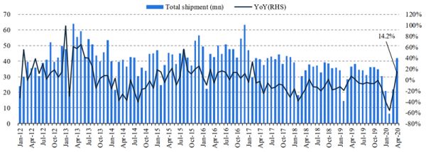 国内手机1Q20 出货受特殊情况影响同比降 36%(信通院),但 4 月出货同比增长14.2%,需求出现可喜反弹。4 月下旬以来,海外 COVID-19 新增确诊人数见顶,美国、印度等国家陆续放松复工。主要品牌如苹果、三星,部分海外线下零售店恢复营业,有效改善下游需求。海外终端需求有望从 5 月开始逐渐复苏,但二季度仍可能是全球需求低点,维持全年出货量预期 12.3 亿部(-13%)。二季度后半供应链公司或调整供应链订单以消化库存,若海外需求恢复较快,订单亦有希望回补。