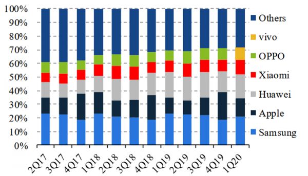 据 IDC,1Q20 全球智能手机出货下滑 11.3%。2020 年第一季度,全球智能手机出货 2.76 亿部,同比-11.3%。市场份额前五为三星 21.1%(-1.9ppts)、华为 17.8%(-1.1ppts)、苹果 13.3%(+1.5ppts)、小米 10.7%(1.8ppts)、vivo9.0%(+1.6ppts)。OPPO 本季掉出前五名,让位于 vivo。