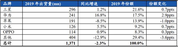 IDC 统计数据,2019 年全球智能手机出货 13.71 亿部,同比下滑 2.3%,已经是连续第三年下滑。华为/小米/三星/OPPO 份额分别提升了 2.9/0.7/0.7/0.3ppts,出货量逆势增长 16.8%/5.5%/1.2%/0.9%。