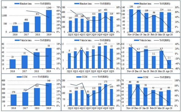 舜宇 4 月出货量同比:手机镜头-1.8%,车载镜头-44.4%,手机摄像模组+12.7%。2020 年 4 月,舜宇光学科技手机镜头出货 111.2 百万颗,环比-2.4%,同比-1.8%,主要由于终端需求低迷;车载镜头出货 2.1 百万颗,环比-51.6%,同比-44.4%,主要是受海外疫情影响延迟发货;手机摄像模组出货 43.8 百万颗,环比+11.1%,同比+12.7%,主要是因为市场份额的提升。